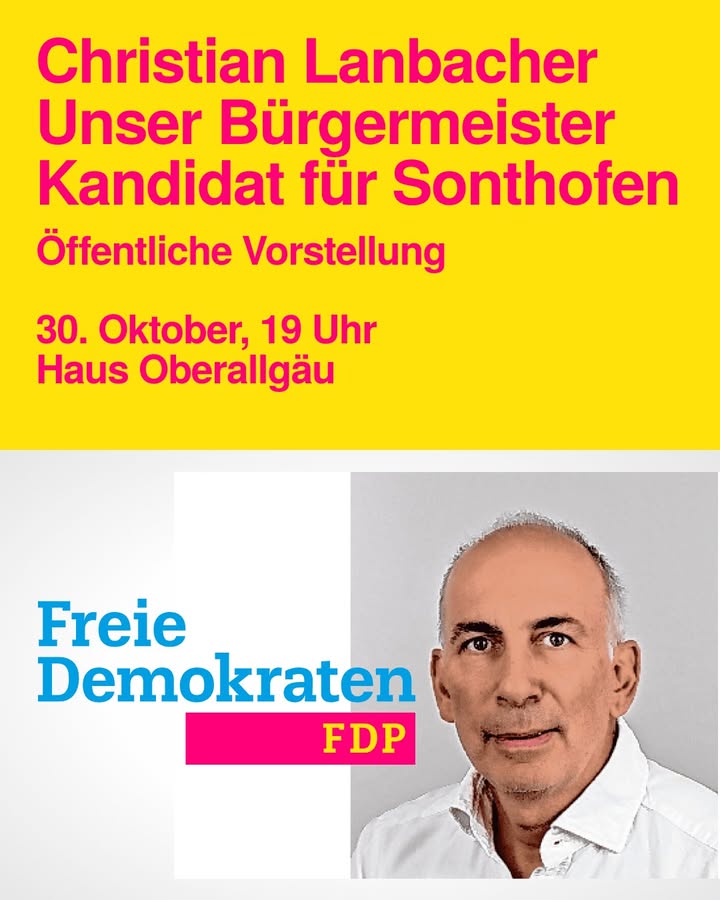 Christian Lanbacher kandidiert als Bürgermeister für Sonthofen „Mich haben Stimmen aus der Stadt erreicht, dass der Schwung in Sonthofen etwas fehlt. Ich bin der Auffassung, dass sich einiges tun muss, was Wirtschaft und Tourismus betrifft. Da will ich etwas bewegen“ Der 61-Jährige Christian Lanbacher ist seit 2002 als Stadtrat aktiv und tritt mit seiner Kandidatur der Partei der Freien Demokraten bei. Er war 20 Jahre für die Freien Wähler im Gremium, ehe er 2022 austrat und parteilos im Stadtrat saß. „Ich möchte meine Erfahrung aus Stadtrat und Unternehmertum zum Wohl unserer Stadt einsetzen. Mein Ziel ist ein starkes und lebenswertes Sonthofen – gestaltet im Dialog“, erklärt Lanbacher. „Es braucht in Sonthofen eine gewisse Offenheit, auch was Investoren betrifft. Da gilt mein Fokus auch der Hotelentwicklung, der Wirtschaft allgemein und dem Tourismus. Es gibt so viele Dinge, die man in der Stadt beschleunigen könnte.“ Am 30. Oktober stellt sich Lanbacher der Öffentlichkeit vor - ab 19 Uhr im Haus Oberallgäu.
